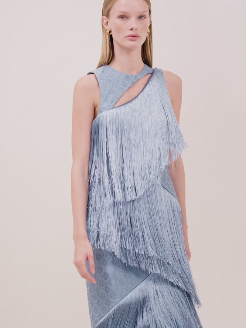 The Costa Dress is a sleeveless silhouette adorned with fringe detailing and finished with an asymmetric hem for added movement and modern edge.