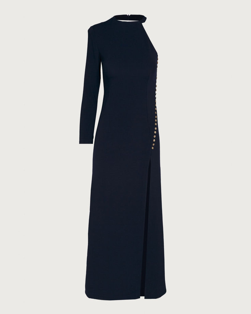 Chic and contemporary, this navy blue top features a striking one-sleeve design and asymmetrical hemline. Side button detailing adds a touch of sophistication, while the discreet side closure ensures a flattering fit.