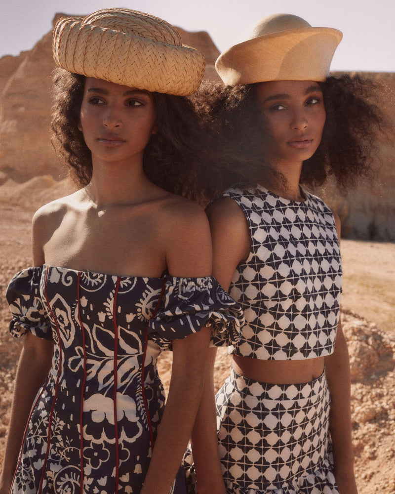 Midi dress with a crew neckline featuring a floral print in shades of blue. Puff short sleeves add volume and charm. Fitted silhouette with contrasting red piping. Invisible back zipper closure.