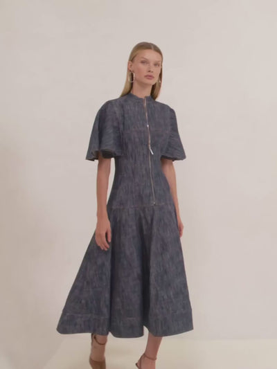 The Weston Dress is a zip-front midi dress with flounced sleeves and a structured flared hem.