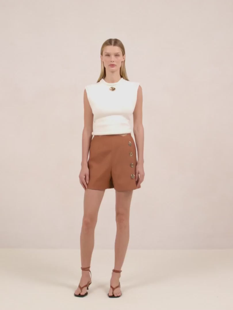 The Xander Short is a high-waisted tailored short featuring a button front with sculptural gold hardware and a scalloped hem.